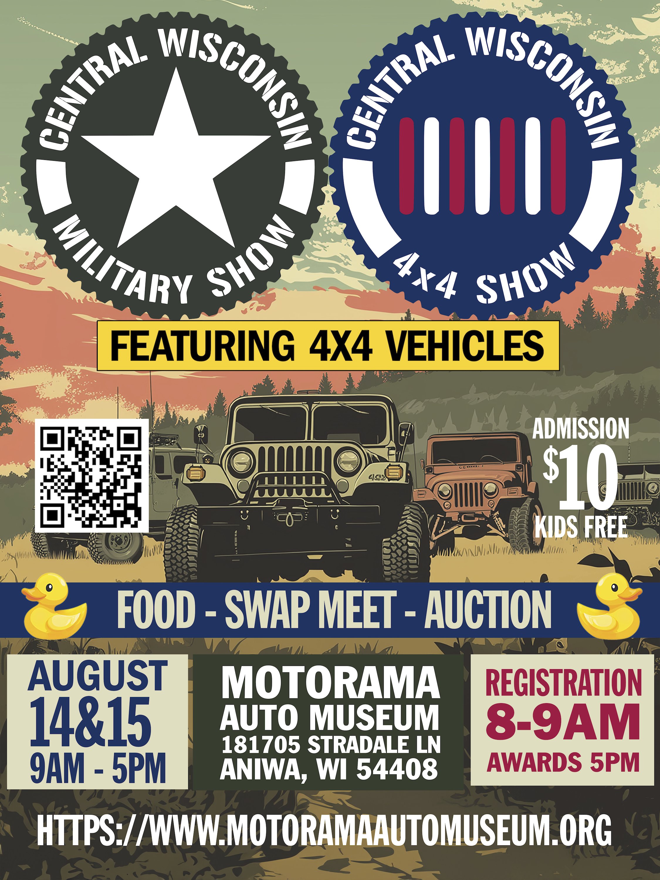 Join us for Wisconsin's largest military show, now featuring the Wisconsin 4×4 Show and Jeep showcase! Experience our signature vehicle displays, swap meet, and awards, plus an exciting expansion welcoming Wisconsin's Off-Road and 4×4 community to the Motorama Event Grounds. Don't miss our charity auction and the chance to be part of this incredible combined event! Visit the Event Page for details.